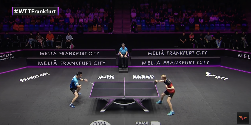 反手準備,我們只要先移動腳步,確認版型可以對到球,接下來再開始思考手腕要讓板頭往下引拍多少。一邊盯球,在球飛到球拍前面的時候,引拍頂,兩者連著,一氣呵成。這就像是之前教我的口訣:(眼睛和手腕)跟球,跟到後轉(手腕)頂(手腕)。